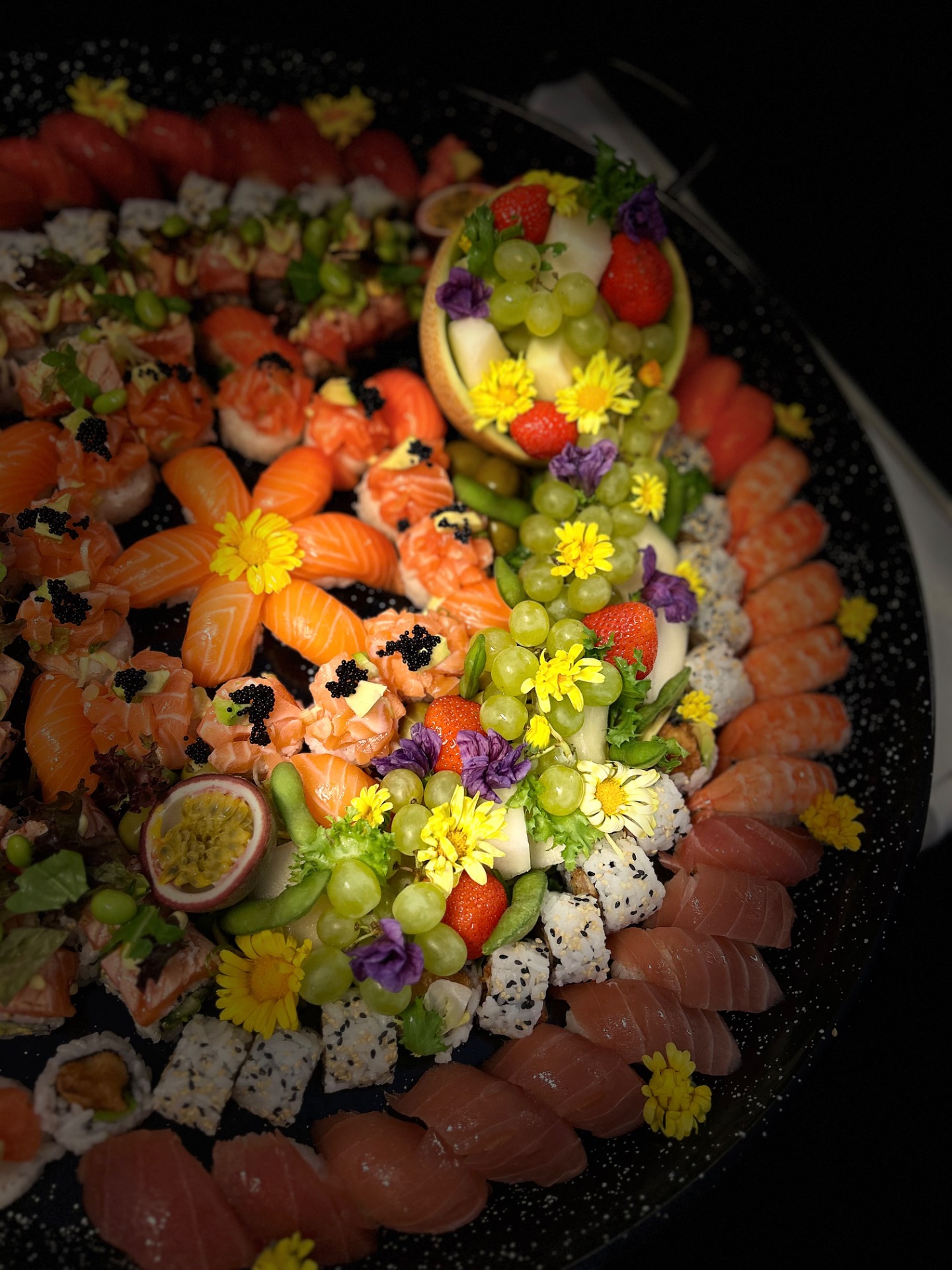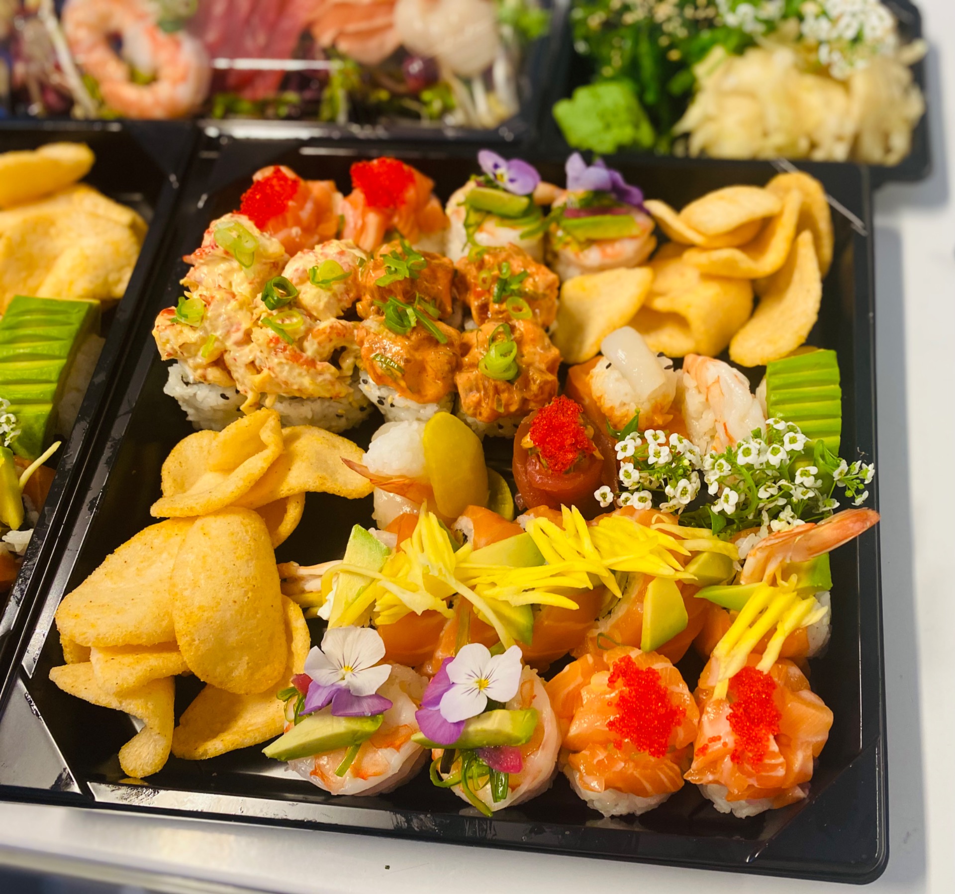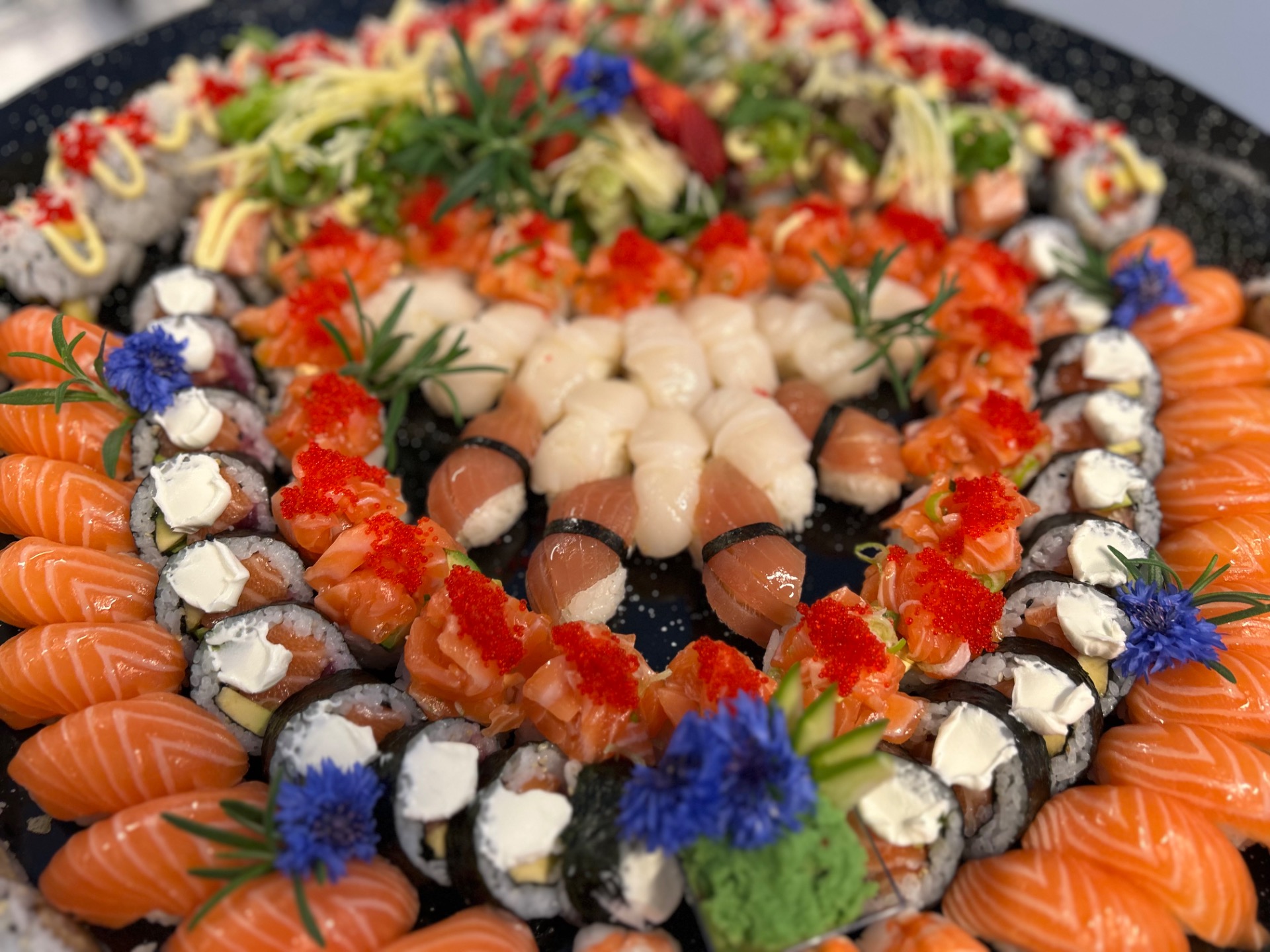 avokado, laks, kamskjell, scampi, agurk, spicy majo, green soy crepé